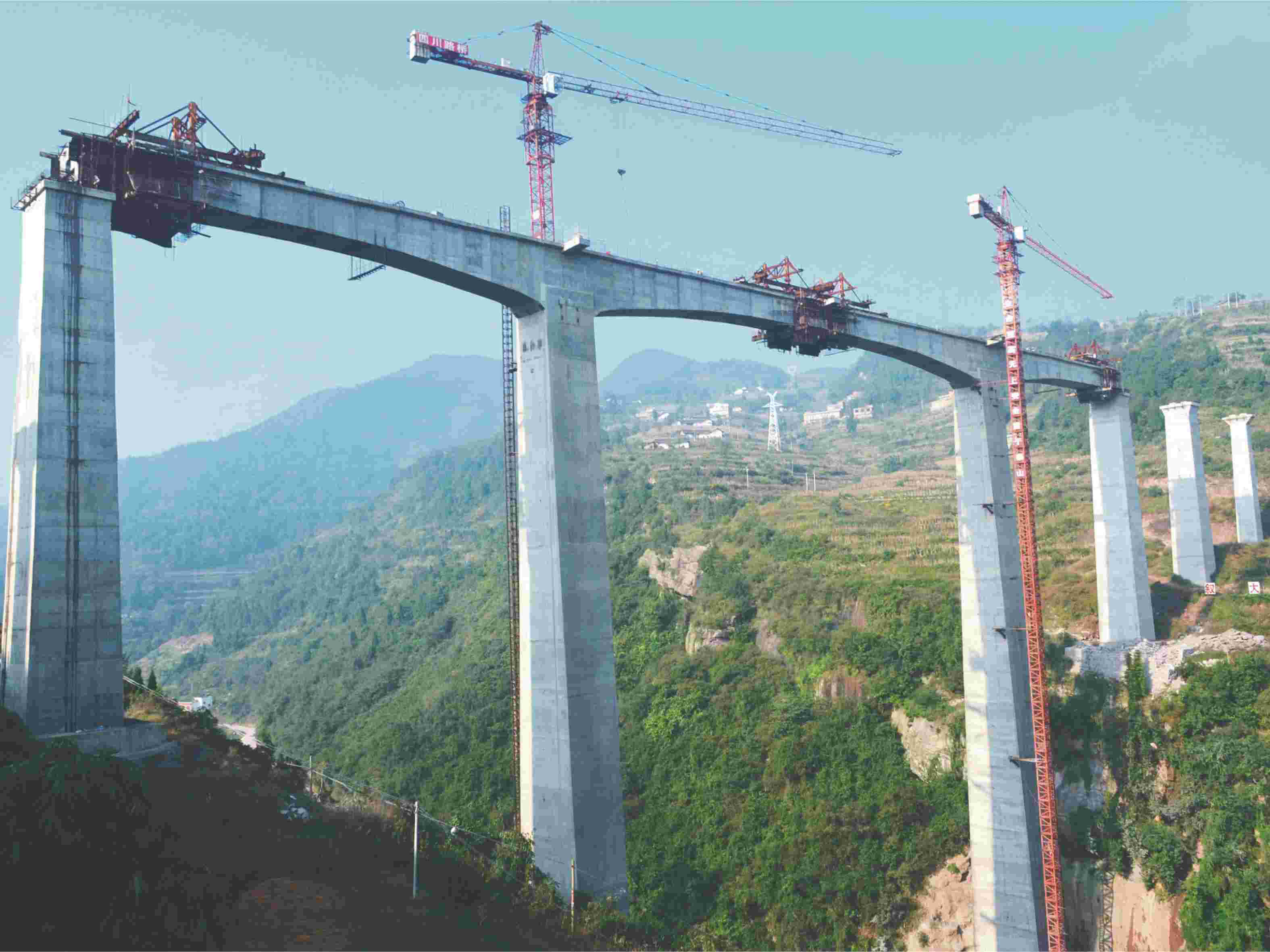 赤水河大橋全長2009米,主橋為1200米雙塔單跨鋼桁梁懸索橋,貴州岸為重力式錨碇,四川岸為隧道式錨碇。大橋主跨1200米,主塔高243.5米,是世界山區同類型懸索橋梁中第一高塔、第二大跨的峽谷大橋,重力式錨碇和隧道式錨碇組成構件巨大。貴州岸引橋為230+4(440)m先簡支后…
